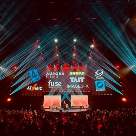 Also featured in the rig were the Maverick MK3 Wash, Rogue R2X Wash, and Rogue R1 BeamWash. Rehbein arranged the MK3 Washes on vertical torms to complement the MK3 Profiles and positioned most of the R2X units on the four fingers over the stage to work with the MK3 Spots. The R2X units were positioned in the ‘Plaza’, an area that featured hanging set pieces from Atomic along with material from TAIT that highlighted client projects.